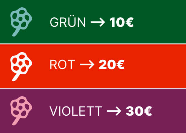 Am Naschmarkt soll’s schnell gehen: anschauen, verlieben, mitnehmen. Darum haben wir drei Sticker Farben, die für einen Preis stehen: Grün für 10€, Rot für 20€ und Violett für 30€. So sind Bundware und Bouquets klar gekennzeichnet – Sorten variieren je nach Saison, die Preislogik bleibt: Stickerfarbe = Preis. Damit siehst du sofort, ob’s „was Kleines Nettes“ oder „richtig was fürs Auge“ wird.